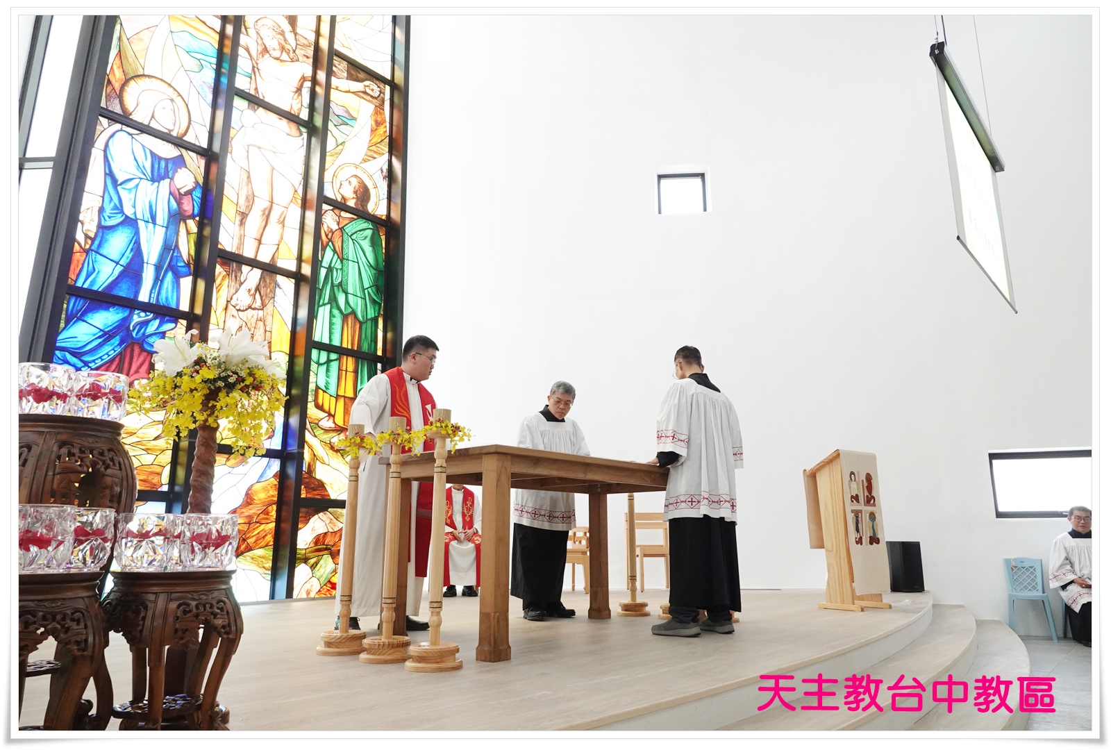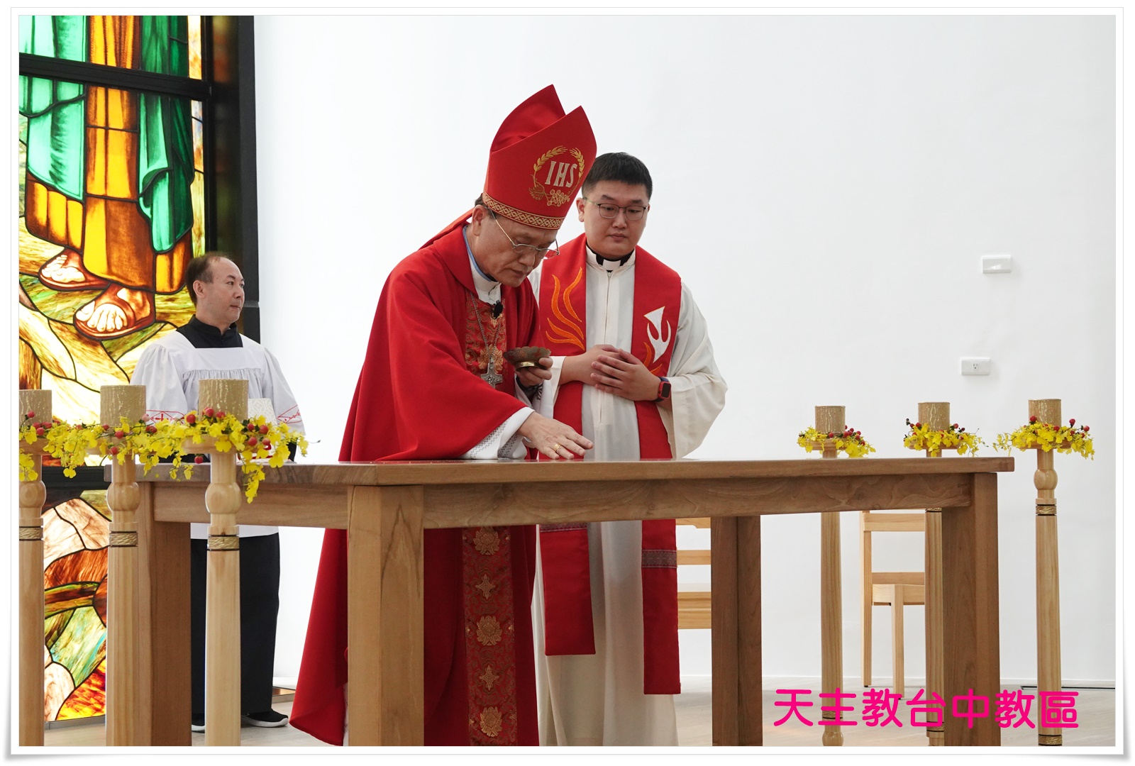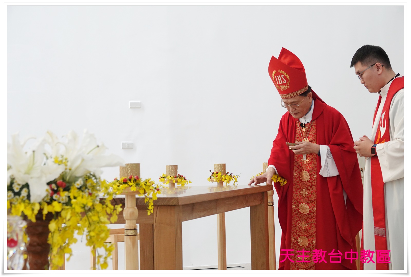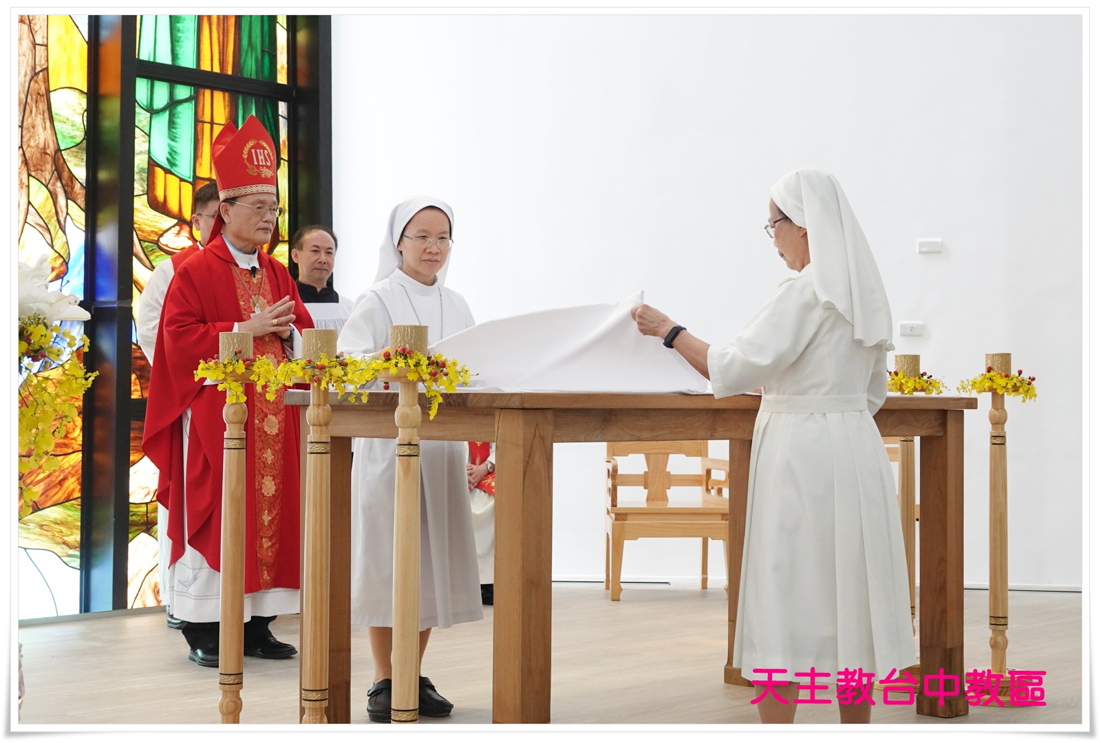 修女們鋪上祭台布,放置鮮花,劉美嘉修女手持復活蠟,吳總會長從復活蠟引火,點燃六支蠟燭,全體詠唱<世界之光>,聖堂內所有燈光亮起,願基督的光照耀這座聖殿,並由這聖殿發出光芒,照遍大地,使萬民得知完全的真理,蘇主教向至聖所獻香後,盧成珉神父巡行聖堂,向聖堂及信友們奉香,我們如此喜悅在這新聖堂舉行首次感恩聖祭,聖堂內滿溢恩寵,氣圍如此神聖隆重動人!
