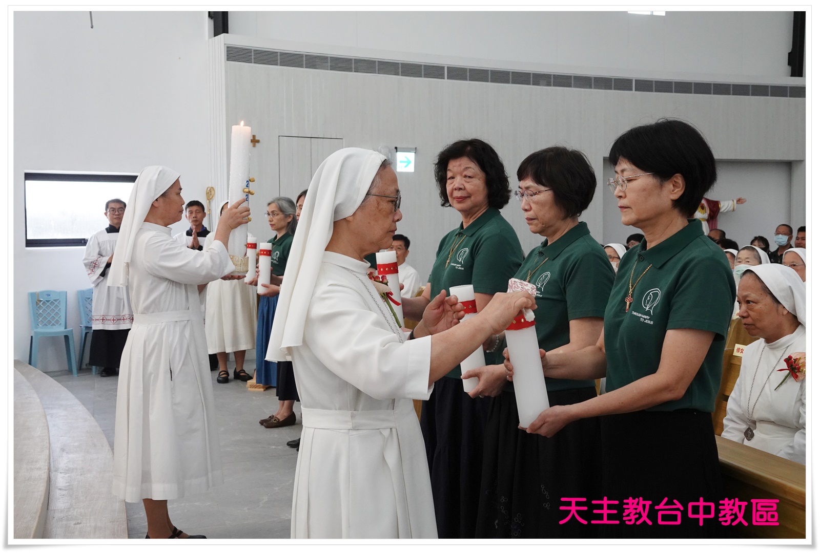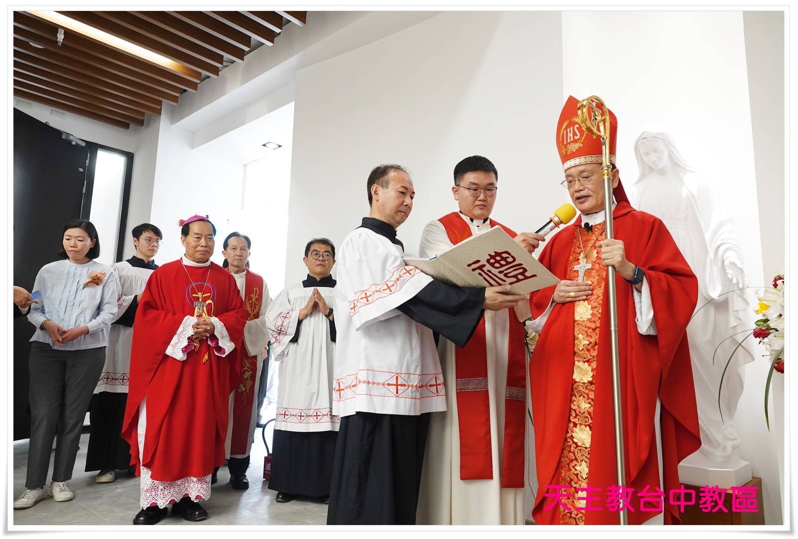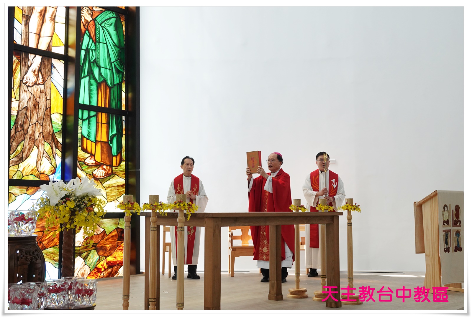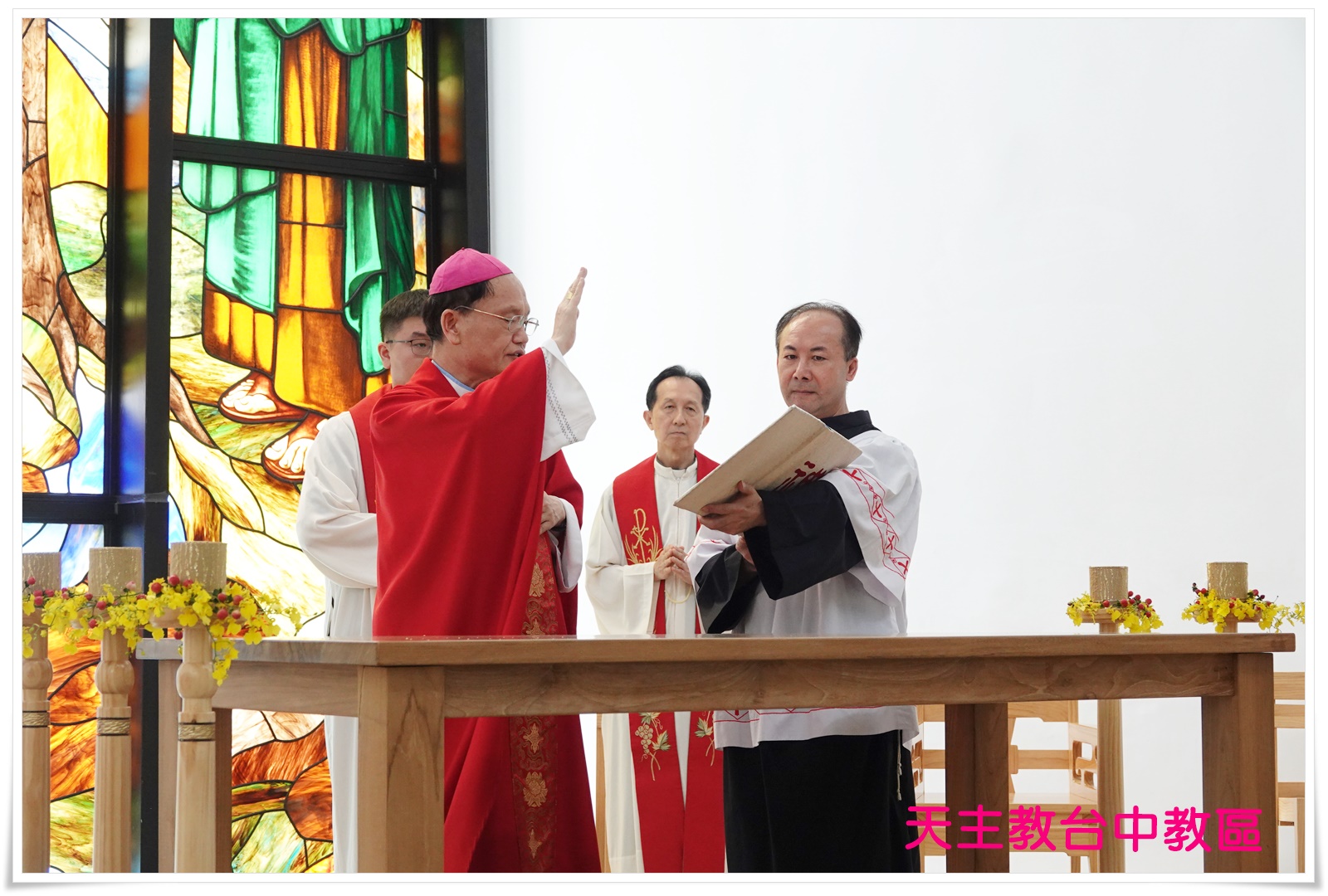 修女們鋪上祭台布,放置鮮花,劉美嘉修女手持復活蠟,吳總會長從復活蠟引火,點燃六支蠟燭,全體詠唱<世界之光>,聖堂內所有燈光亮起,願基督的光照耀這座聖殿,並由這聖殿發出光芒,照遍大地,使萬民得知完全的真理,蘇主教向至聖所獻香後,盧成珉神父巡行聖堂,向聖堂及信友們奉香,我們如此喜悅在這新聖堂舉行首次感恩聖祭,聖堂內滿溢恩寵,氣圍如此神聖隆重動人!
